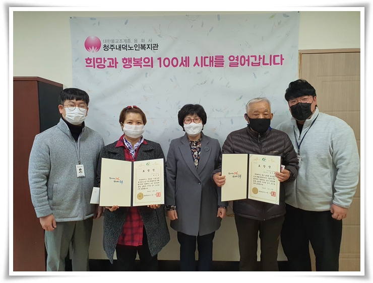 지난 16일, 관장실에서 2020년 한해동안 이웃사랑을 실천하고 자원봉사에 헌신하신 우수자원봉사자 및 9988행복지키미 모범어르신에게 충청북도지사 훈격의 표창장을 전달하였습니다. 올해는 코로나19 확산여파로 연말 시상식이 모두 취소되어 부득이하게 관장님이 대신하여 전달했으며, 코로나 방역지침에 준하여 소수인원이 참석한 가운데 진행되었습니다. 9988행복지키미 유공자로 선정된 정진호 어르신은 5년째 내수읍지역 위기가구 독거어르신을 남다른 정성노력으로 가족처럼 돌본 공로를 인정받았으며, 충청북도사회복지협의회 우수자원봉사자로 선정된 박은옥님은 6년간 재가노인 식사배달과 꾸준한 헌혈 참여로 이웃사랑을 실천하고 계십니다. 수상하신 분들께 축하드리며 저희 복지관과 함께 해주셔서 감사드립니다. 여러분과 함께 어르신이 행복한 지역사회를 만드는데 더욱 매진하겠습니다. |