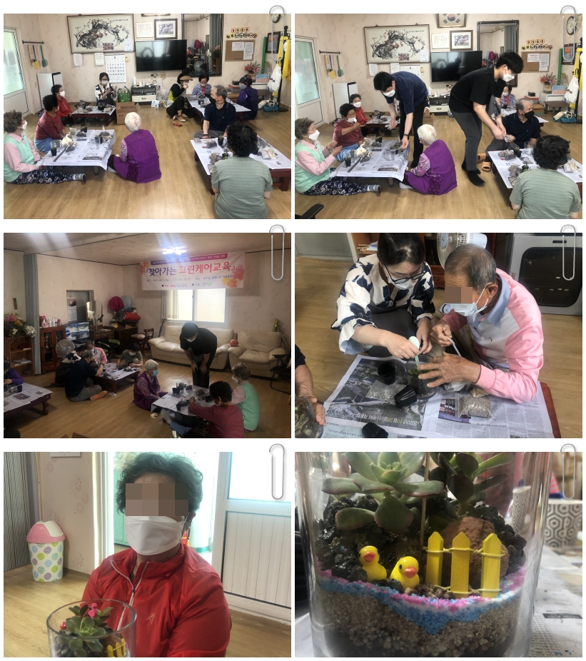 저희복지관에서는 금일 14:00~16:00까지 내수읍에 위치한 형동1리 경로당에서 "찾아가는 그린케어교육" 3회기를 실시하였습니다~! 경로당 이용어르신 총 10명이 참여하여 원예교육(테라리움)으로 진행되었으며, 유리병 안에 나만의 정원을 만들고 가꾸는 원예활동으로 진행되었습니다~! 참여하신 어르신 모두 즐거워 하시며 프로그램을 마무리 할 수 있었습니다~! 오늘 참여해 주신 어르신들께 감사드리며, 원예활동교육을 지도해주신 강사님께도 감사드립니다^^ 앞으로도 농촌지역 어르신들의 건강과 행복을 위해 청주내덕노인복지관은 농촌지역을 꾸준히 찾아가 어르신들에게 힘이 되도록 노력하겠습니다~! ※경로당 프로그램 진행을 위해 사전 참여자분들의 발열체크 및 마스크 착용여부 확인하면서 방역수칙을 준수하여 프로그램을 진행하였습니다~!