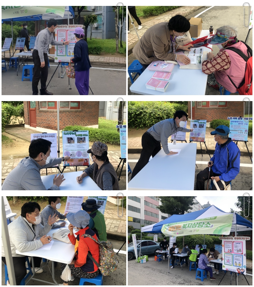 저희 복지관에서는 5월 27일 14:00~16:30분까지 내수읍 삼일아파트 일대에서 청주행복네트워크와 함께 진행하였습니다~! 이번 복지상담소에서는 복지관 프로그램 운영 안내와 노인사회활동 지원사업 9988행복지키미 수요자 모집 안내, 저소득 어르신 신청 안내 등 전반적인 사업 안내를 실시하였으며 특히, 저소득 독거노인을 위한 복지관 재가서비스 안내 및 복지사각지대 발굴을 위한 재가복지캠페인을 실시하였습니다. 코로나19 관련 안전수칙 및 지역주민들에게 마스크를 배부하였으며, 행사를 진행하면서 거리두기 안내 및 마스크 착용 안내 등 방역수칙을 준수하면서 행사를 진행하였습니다~! 농촌지역 어르신들과 지역주민들을 위해 매달 복지상담소는 청원구 농촌지역을 찾아가겠습니다~!