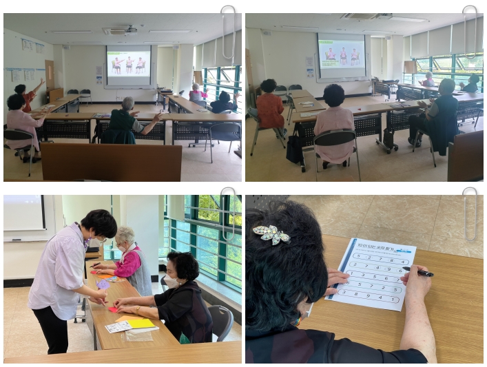건강생활지원사업 치매예방교실 13회기를 복지관 2층 으뜸방에서 진행하였습니다~! 이번 회기에는 기억노트 작성, 치매예방체조, 종이접기 활동, 문제풀이(수리능력, 집중력, 계산력)등 진행하였습니다~! 참여 어르신들 모두 적극적으로 참여해 주셔서 프로그램 운영이 원활히 진행될 수 있었습니다~! 참여 어르신들 모두 감사드리며, 앞으로도 다양한 프로그램을 구성하여 어르신들의 치매예방에 도움이 될 수 있도록 하겠습니다^^
