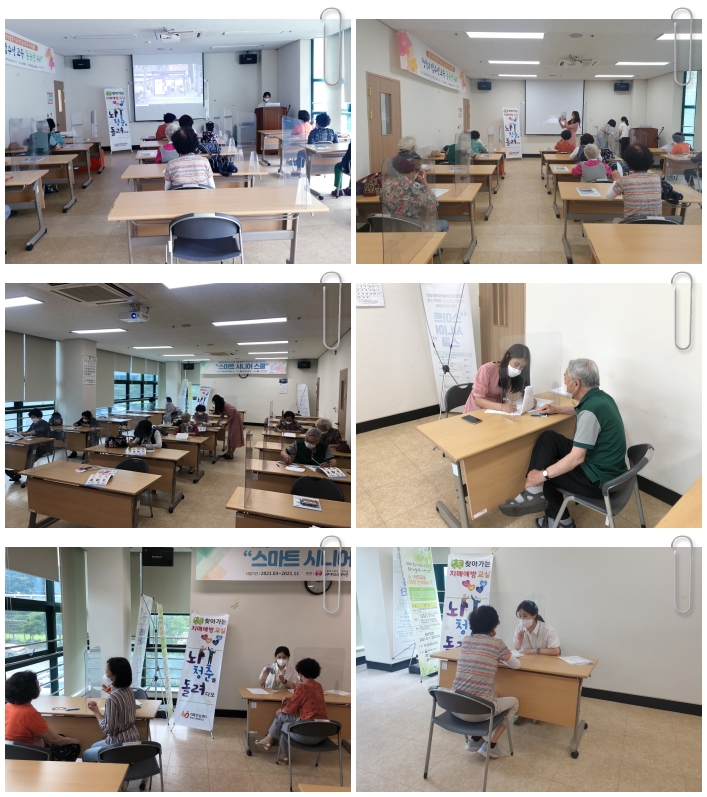 저희복지관에서 6월 17일(목) 14:00~15:00까지 복지관 2층 배움방에서 청원보건소 치매안심센터와 함께 찾아가는 치매예방인지강화교실 프로그램을 진행하였습니다~! 치매예방인지강화교실 프로그램은 치매에 대한 사회적인식개선과 지역주민의 인지건강을 증진하여 치매발병률을 감소시키고자 청원보건소 치매안심센터와 함께 진행하게 된 프로그램입니다~! 인지자극 및 인지활동 프로그램 웹코트를 활용하여 프로그램이 운영 될 예정이며 이번시간에는 인지선별검사를 통해 참여 어르신들의 인지건강상태를 확인하는 시간으로 진행되었습니다~! 앞으로 총 8회기 진행 예정이며, 어르신들의 인지건강을 위해 더욱 더 노력하겠습니다~!