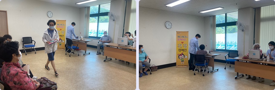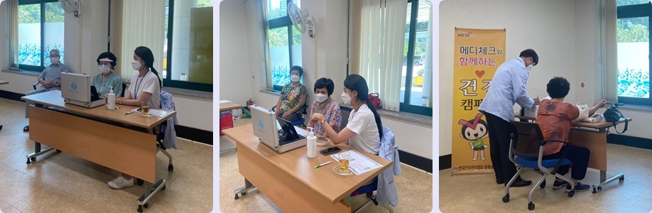 저희 복지관에서는 7월 21일(수) 13:00 ~ 16:00, 한국건강관리협회 충북세종지부와 함께하는 건강캠페인을 실시하였습니다. 금일 캠페인에서는 혈압체크 및 스트레스지수 검사를 통해 건강의 중요성을 인식할 수 있는 시간을 가졌습니다~! 혈압측정을 위해 사용된 혈압계는 국제공인기관(ESH/AAMI)기준을 통과한 국제 인증 혈압계이며, 스트레스 측정기는 식약처에서 안전성을 인정받은 OMNFIT측정기로 뇌파와 맥파를 활용하여 우울감, 피로도, 신체나이 등 자신의 다양한 건강상태를 파악할 수 있는 기기입니다. 더운 날씨에도 캠페인에 참여해주신 어르신들께 감사드리고, 직원분들 모두 고생 많으셨습니다~! 앞으로도 어르신의 건강증진을 위해 다양한 캠페인과 프로그램을 진행하는데 노력하겠습니다~~ ※ 캠페인 진행에 앞서 어르신들의 안전을 위해 발열체크 및 마스크착용 여부 확인 하여 진행하였습니다. ![]() <스트레스 지수 검사> <혈압측정> ![]()