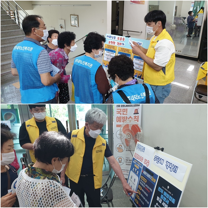 선배시민자원봉사단 너나들이 봉사단이 07.29.(목) 09.30~11:30 복지관 1층 로비에서 노인안전에 대한 캠페인을 실시하였습니다. 코로나 3단계에 따른 행동요령, 노인 학대, 노인 우울 및 자살, 금융 피해 예방 및 관련 정보 기관에 대한 정보판을 제작하여 안내하였습니다. 꼭 알아야할 정보를 동년배에게 설명함으로서 스스로도 인지할 수 있는 기회가 되었고 지역주민들이 쉽게 이해할 수 있는 시간이 되었습니다. 8월에도 동년배에게 친구가 되어주는 봉사단이 되기 위해 노력하는 모습을 보이도록 하겠습니다!