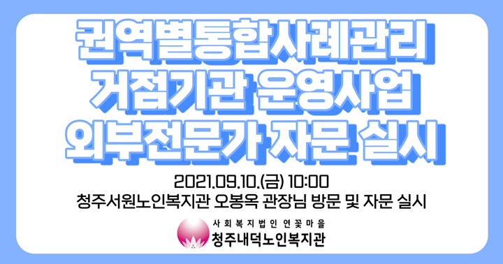 2021년 9월 10일 청주서원노인복지관 오봉욱관장님께 권역별 통합사례관리거점기관운영에 필요한 재가서비스의 개발과 자원연계의 효과성에 대한 외부전문가 자문을 실시하였습니다.