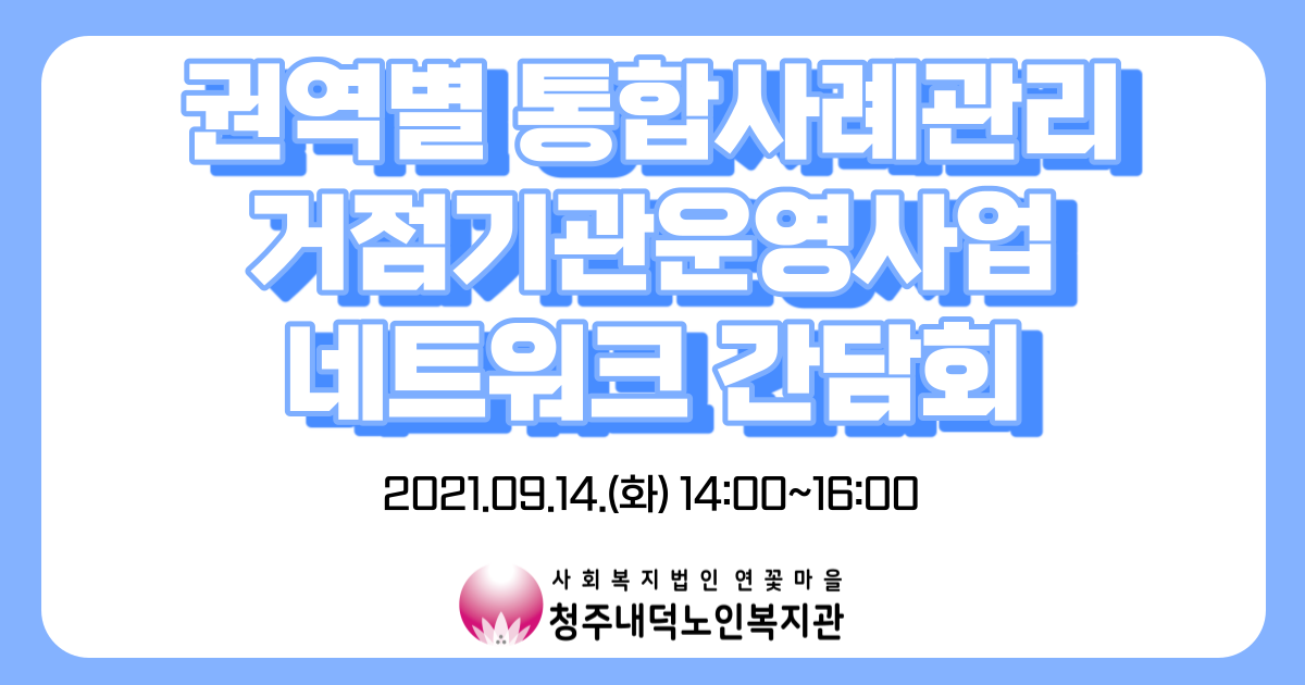 2021년 9월 14일 화요일 오후 2시부터 4시까지 청주내덕노인복지관에서 권역별 통합사례관리거점기관 네트워크 간담회를 실시하였습니다. 청주내덕노인복지관 권역별 통합사례관리 네트워크 협약기관에는 내덕2동행정복지센터, 오창읍행정복지센터, 청원보건소 치매안심센터, 청원정신건강복지센터, 사회적 협동조합 휴먼케어, 청주행복네트워크, 충북노인보호전문기관이 함께 청원구 어르신들의 어려움을 함께 해결하고자 노력하고 있습니다.