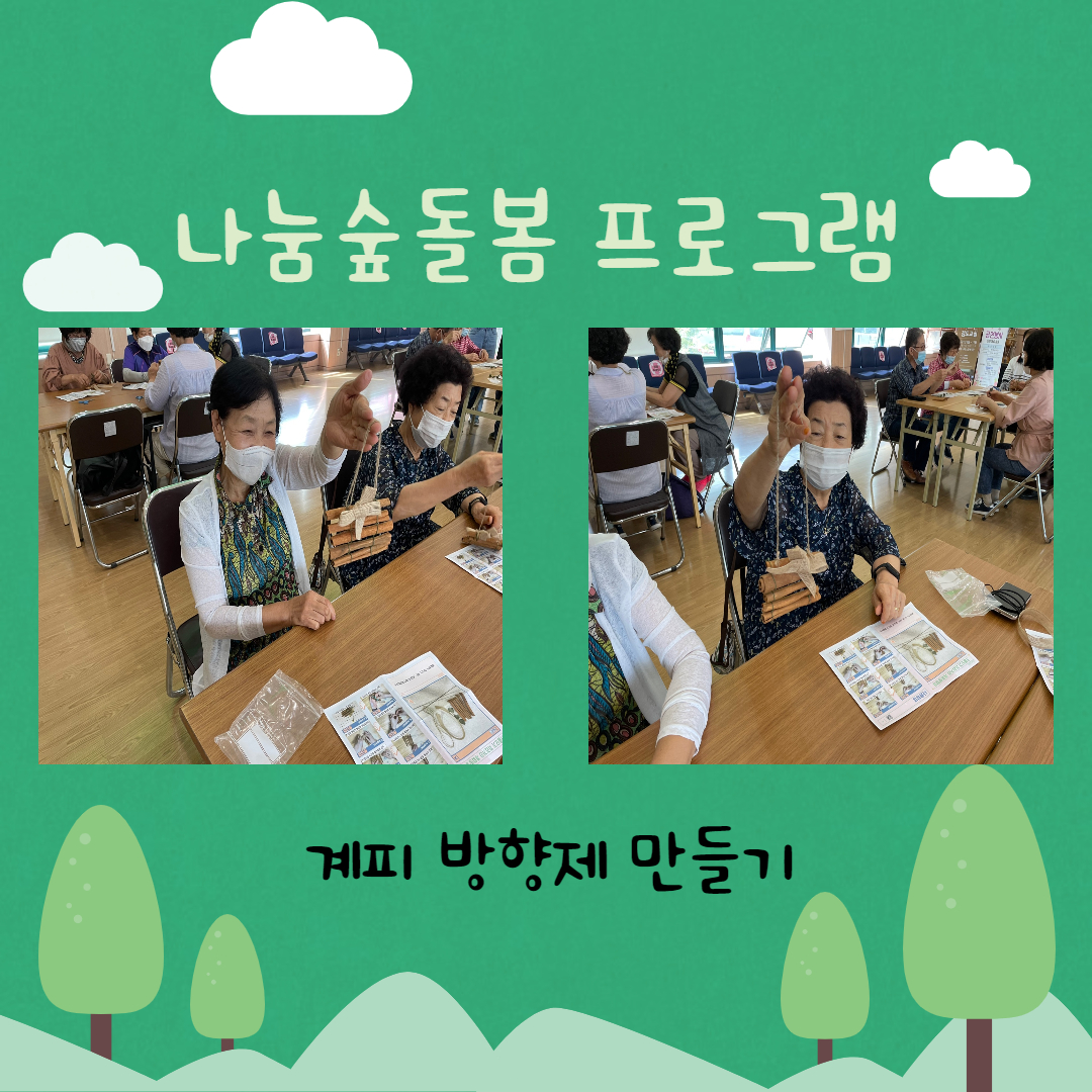 9월 16일 오전 10시 30분 강당에서 나눔숲돌봄 프로그램이 진행되었습니다 이번 시간에는 계피를 활용한 모기퇴치제, 가을작물인 고구마를 활용한 고구마 케이크를 만들어 보았습니다 가을모기가 극성인 요즘 계피냄새로 모기를 쫓아내었고 비록 복지관에서는 드시지 못하지만 가정에서 달달한 고구마케이크로 한끼 식사를 할 수 있었습니다! 다양한 주제로 진행되었던 나눔숲돌봄 프로그램이 9월 30일 마지막 회차를 남겨두고 있습니다 마지막까지 참여자들이 즐겁게 참여할 수 있도록 준비하도록 하겠습니다!