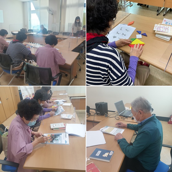 저희 복지관에서는 금일 10:00~11:00, 1층 상담실에서 치매예방교실 4회기가 진행되었습니다! 이번 시간에는 저번 회기와 같이 치매예방체조로 수업을 시작했습니다. 그리고 칠교놀이와 함께 어르신들의 판단력과 집중력 및 시공간 능력 발달 등 인지 활동에 도움이 되는 내용을 선별한 유인물을 직접 풀어보는 시간을 가지고 치매예방에 도움이 되는 활동을 하였습니다. 또한 오늘은 기억노트에 지난 학창시절을 떠올리며 과거를 회상해보는 시간을 가졌습니다. 과거회상을 통해 지난 날을 기억하는 즐거운 시간이 되었다고 하셨습니다.! 앞으로도 다양한 내용을 구성하여 어르신들의 치매예방에 도움이 될 수 있도록 노력하겠습니다. 참여해주신 어르신들 모두 감사합니다~!