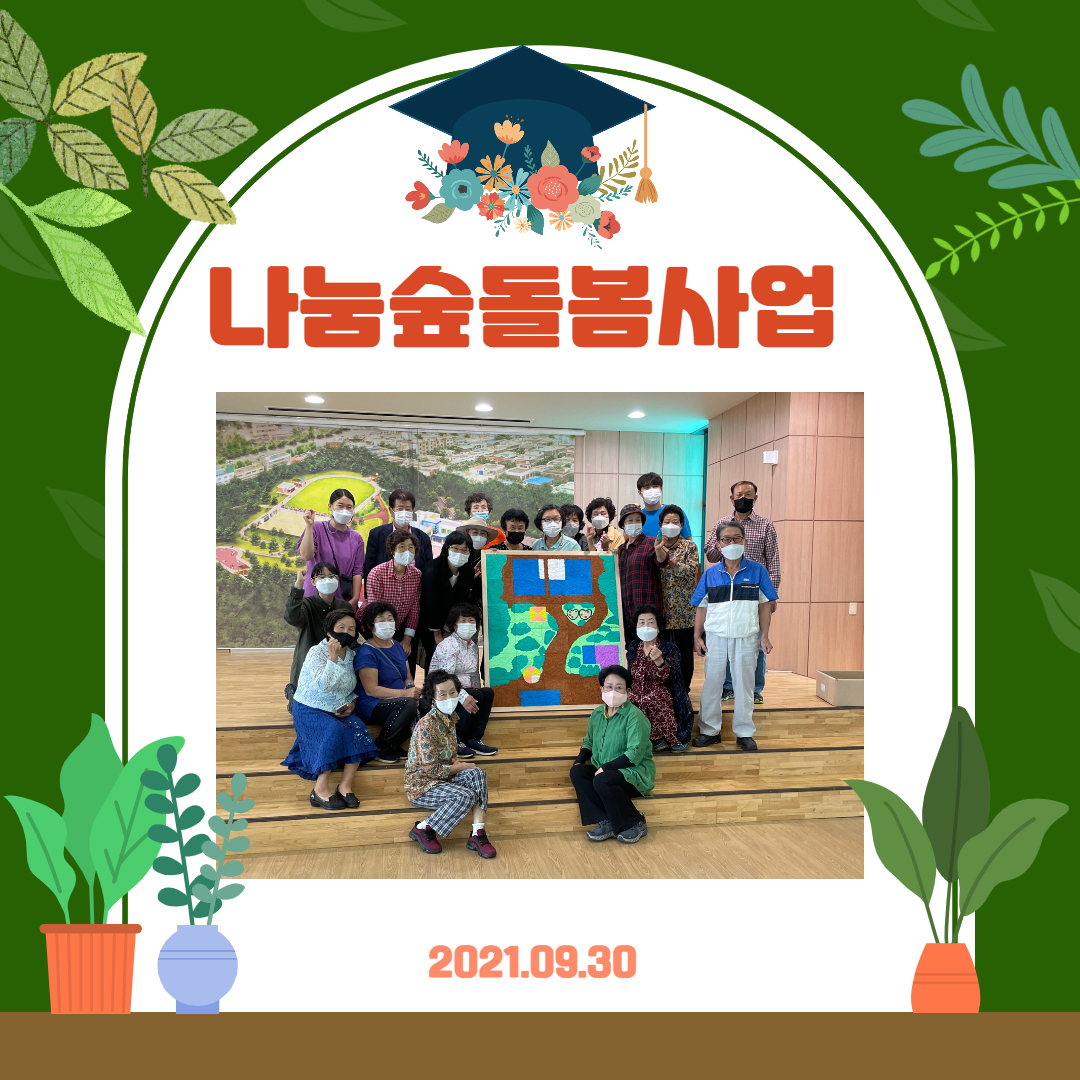 2021.09.30.(목) 1층 강당에서 나눔숲돌봄사업 마지막 회차를 진행하였습니다. 오늘 활동은 마이폼을 활용한 나눔숲전경을 꾸며보았는데요. 저희 내덕노인복지관 나눔숲을 잘 표현한 것 같습니다! 4월부터 시작된 나눔숲돌봄사업이 9월 30일로 마무리되었는데요 다양한 주제로 활동하며 숲과 가까워지는 모습을 보여왔습니다. 앞으로 숲과 하나되어 생활하는 모습을 기대하겠습니다! 지금까지 수고하셨습니다!! |
