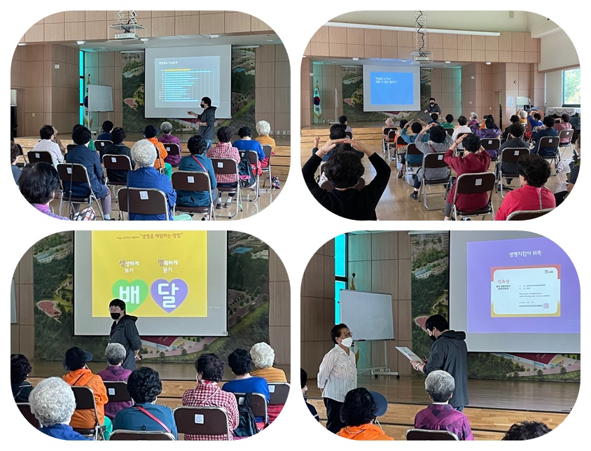 청주청원정신건강복지센터의 지원으로, 청원정신건강복지센터의 차재운 팀장님께서 교육을 진행해주셨습니다. 전국 및 충북의 자살통계를 통해 자살의 심각성을 깨닫고, O/X퀴즈를 통하여 자살에 대한 편견을 깨트리는 시간으로 교육이 시작되었습니다. 또한 자살을 생각하는 이들을 돕는 방법을 배우면서 생명지킴이로서의 교육도 함께 진행되었습니다. 생명지킴이로서 자살을 생각하는 이들을 돕기 위해선 생생하게 보기, 명확하게 묻기, 배려 깊게 반응하기, 달라지도록 돕기의 네 가지를 실천사항으로 배우고 이와 관련된 예시를 영상을 통해 배웠습니다. 금일 교육을 통해 어르신들이 자살의 심각성을 알고 자살에 관한 생각의 변화를 통해 어르신들의 권익증진에 도움이 되는 유익한 시간을 보냈길 바랍니다. 교육을 진행해주신 강사님과 참여해주신 어르신들 모두 감사드립니다!!