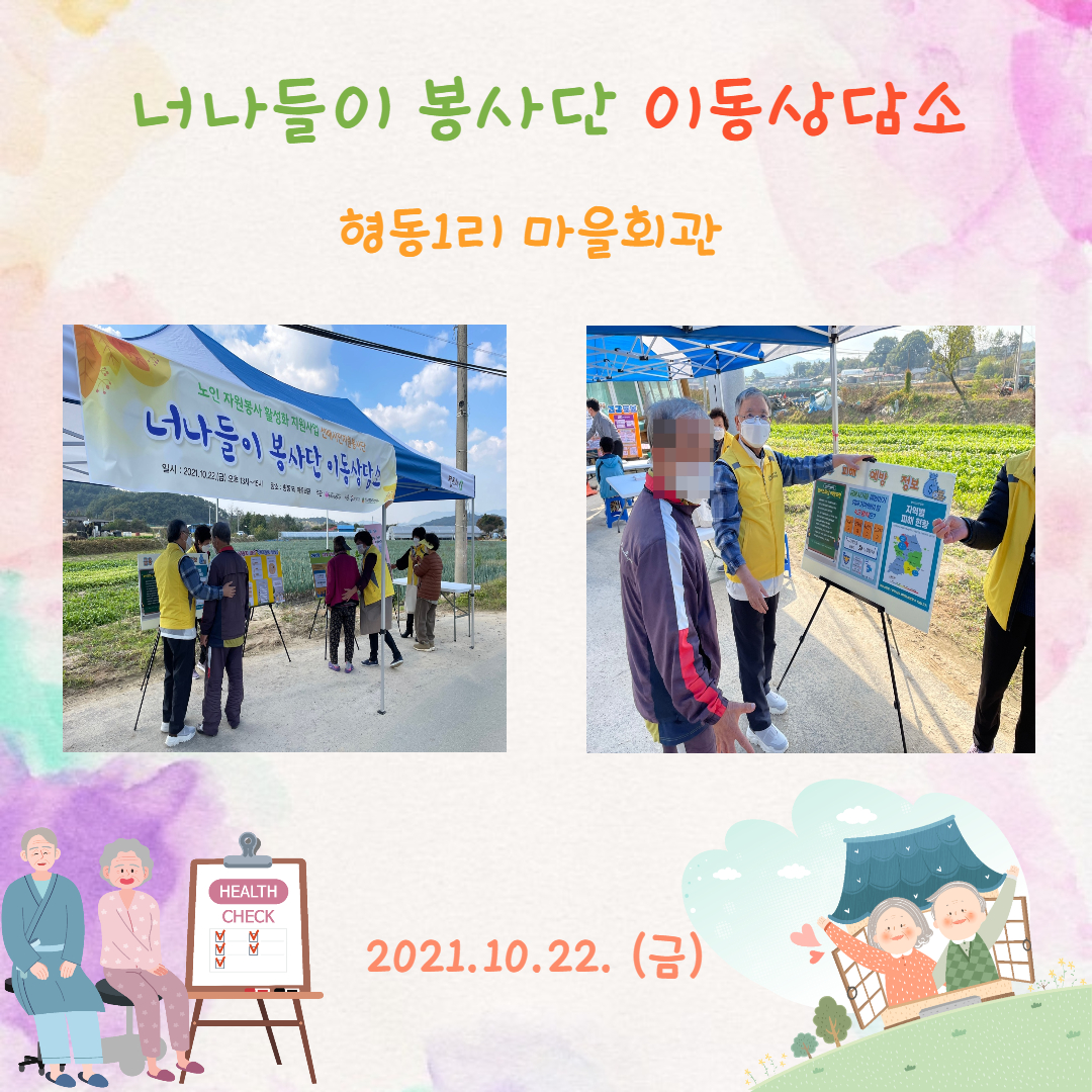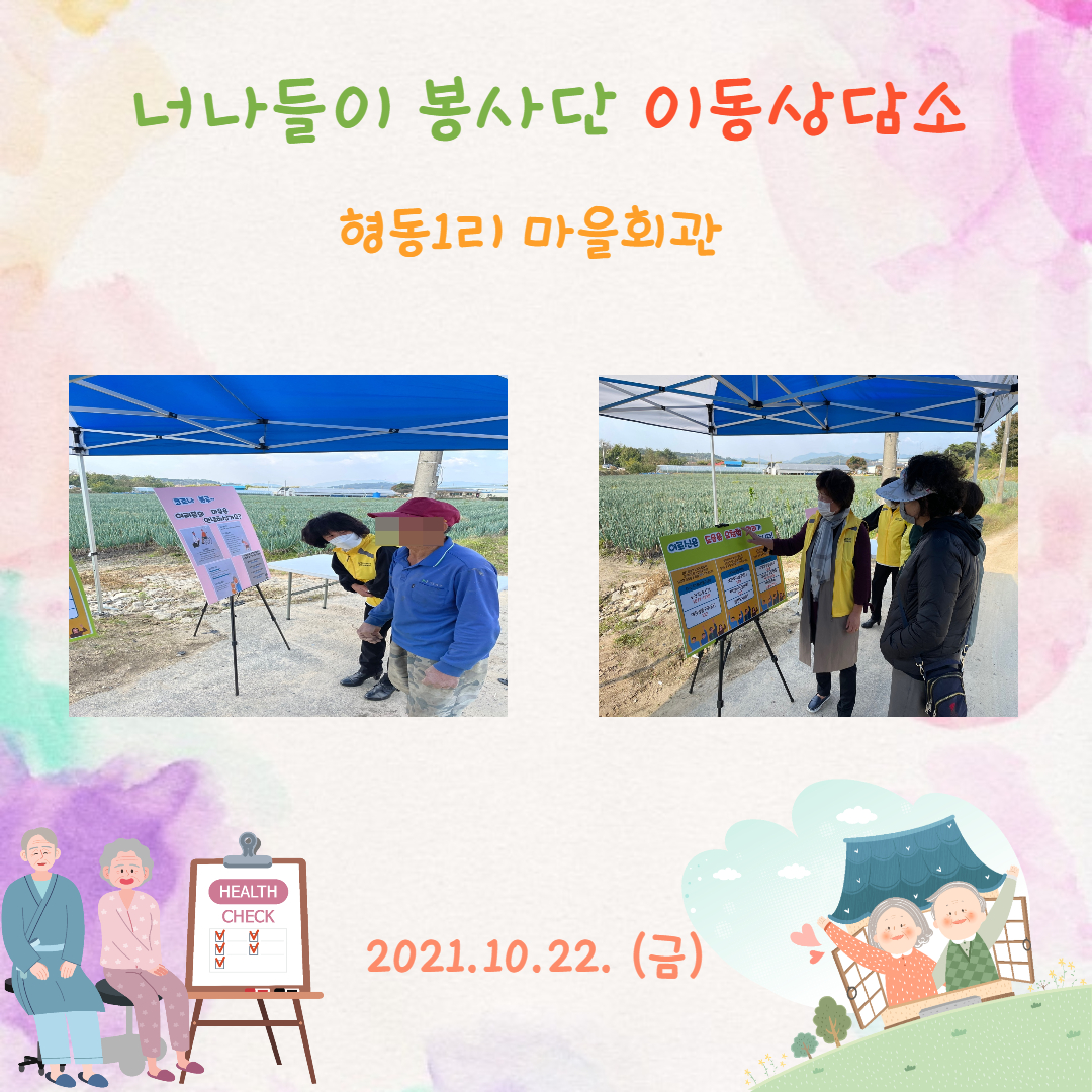 2021.10.22.(금) 형동1리 마을회관 앞에서 너나들이 봉사단 이동상담소 캠페인이 진행되었습니다. 오늘 활동은 금융사기 피해 예방 수칙, 노인학대 및 우울 예방, 분야별 관련 기관 정보를 전달하였습니다. 집에 혼자 있는 시간이 많아진 요즘 그것을 노린 보이스피싱에 당하지 않도록 어르신들에게 정보를 전달하였고 또한 우울감을 가질 수 있는 어르신들에게 관련 상담기관을 알려드리고 같이 극복할 수 있도록 안내하였습니다. 웃으며 다가가는 너나들이 봉사단이 모든 어르신들에게 웃음꽃이 피어나게 하도록 더욱 노력하겠습니다! |