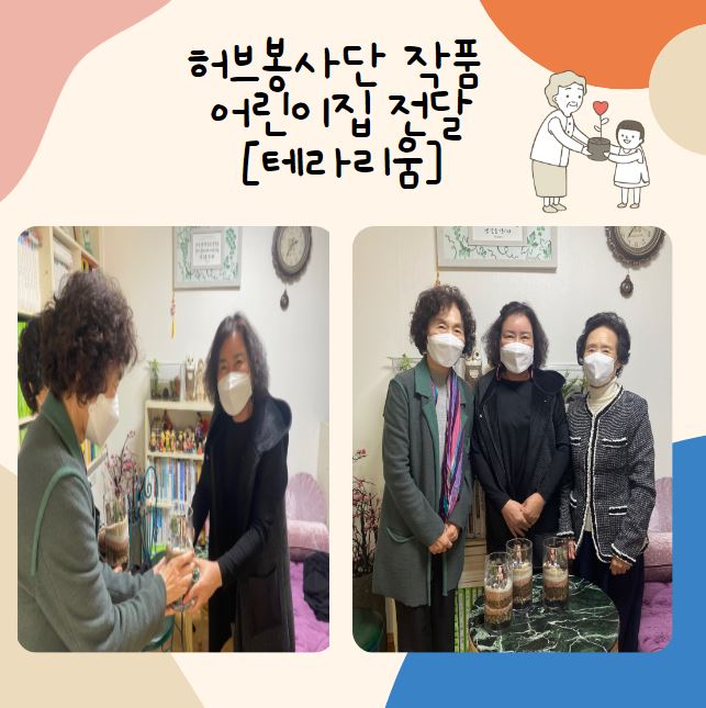 11월 3일 수요일 오후에 허브 봉사단 참여자 2분과 함께 큰산 어린이집에 방문하여 10월 29일에 허브 봉사단분들이 만든 테라리움과 참여자 1분이 어린이들에게 주기위해 만들어오신 팽이와 딱지를 전달하였습니다! 허브 봉사단에서 활동으로 만든 작품들은 큰산어린이집 어린이들에게 기증하고있었는데요. 코로나19로 인해 어르신들이 직접 방문하지 못하였는데 이번에 2분 정도만 같이 전달할 수 있었습니다. 빨리 코로나가 완화되어 어린이들과 함께 만들 수 있는 날이 왔으면 좋겠습니다 |