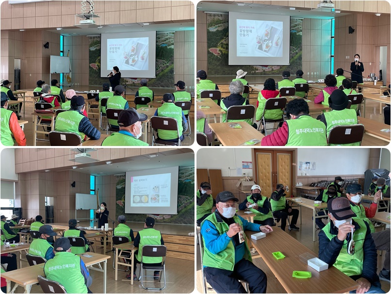 금일 저희 복지관에서는 10:00-12:00, 1층 대강당에서 하천지킴이 참여자 40명을 대상으로 특화교육을 실시하였습니다. 천연왁스에 다양한 꽃으로 장식한 고체방향제인 ‘꽃방향제’만들기를 주제로 실시하였습니다! 꽃방향제 구성품의 효능 및 특성에 대해 알아보고 어르신들의 방식대로 꽃 구성을 하여 직접 만들어보는 시간을 가졌습니다. 실내 공간에 놓아두기만 해도 향기가 퍼지는 인테리어 향기 소품으로, 상큼한 향이 좋다고 하시며 적극적으로 참여해주셨습니다! 앞으로도 다양한 특화교육을 통해 노인사회활동지원사업의 참여자로 활동할 수 있도록 노력하겠습니다. 참여해주신 어르신들 모두 감사드립니다~~!