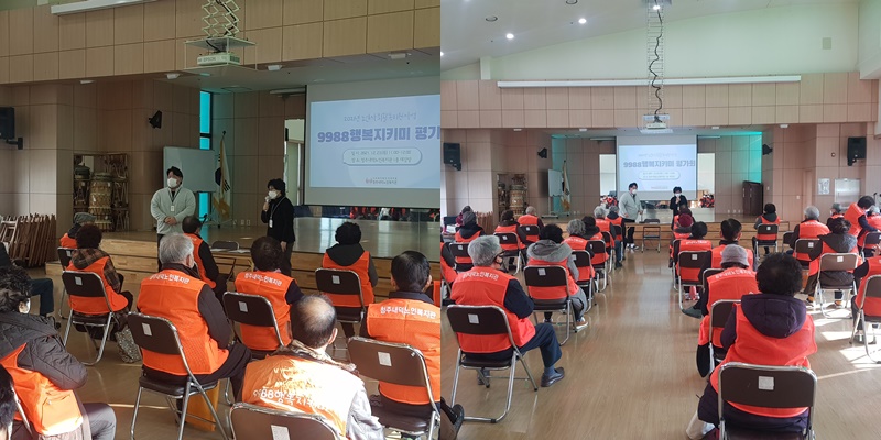12월 23일 11:00~12:00 복지관 대강당에서 9988행복지키미 참여자분들을 모시고 평가회를 실시하였습니다. 참여 어르신들의 활발한 활동 덕에 1년 동안 잘 마무리할 수 있었던 것 같습니다. 어르신들의 활동 상 애로사항이나 건의사항 등 의견수렴과 내년도 참여자 선발안내 등을 통해 활동 진행에 도움을 드리고자 실시하였으며, 평가회를 통해 금년 활동과 관련되어 제시한 의견을 반영 후 앞으로 노인사회활동지원사업에 도움이 될 수 있도록 노력하겠습니다. 또한 코로나19로 인해 여러 애로사항들이 있었지만 올해에도 건강히 모두 참여해주셔서 감사드립니다.