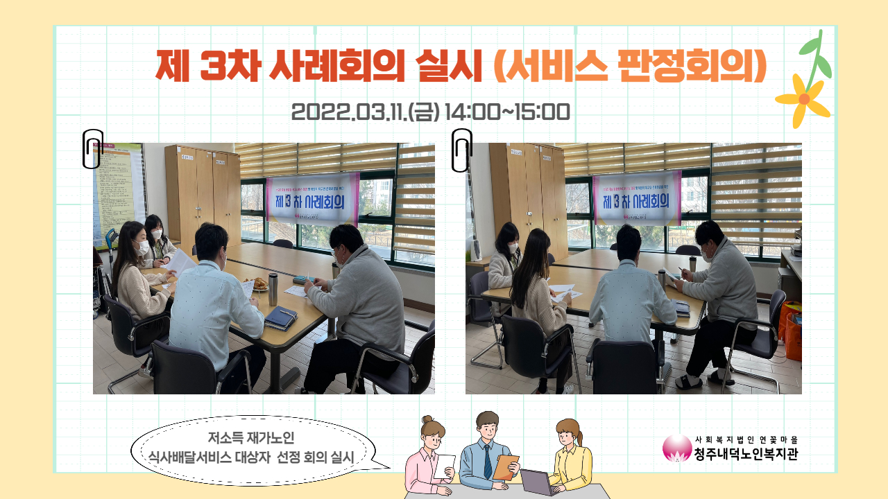 2022년 3월 11일 금요일 14:00~15:30 저희 복지관에서는, 사례관리 담당자들이 모여 서비스 판정회의를 진행하였습니다. 결식우려가 있는 어르신들에게 균형 잡힌 영양 상태 유지를 위해, 급식지원사업인 저소득 재가노인 식사배달사업 대상자의 지원 여부를 회의하는 시간을 가졌습니다. 2명의 대상자들의 경제, 주거, 건강상태 등 전반적인 생활환경을 선정기준표를 통해 파악하고 담당자들 간의 회의를 통해 적절한 대상자를 선정할 수 있었습니다. 그리고 대상자의 또 다른 욕구를 파악해보고, 타 서비스 지원 여부를 논의하였습니다.