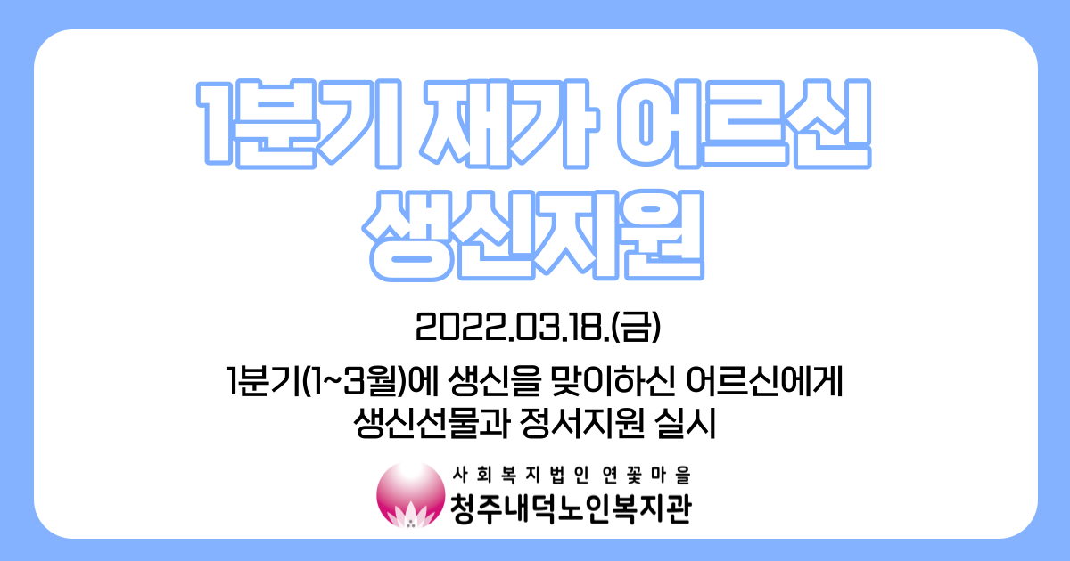 청주내덕노인복지관에서는 2022년 3월 18일 1분기에 생신을 맞이하신 재가어르신들을 대상으로 생신선물 전달과 정서지원을 실시하였습니다.