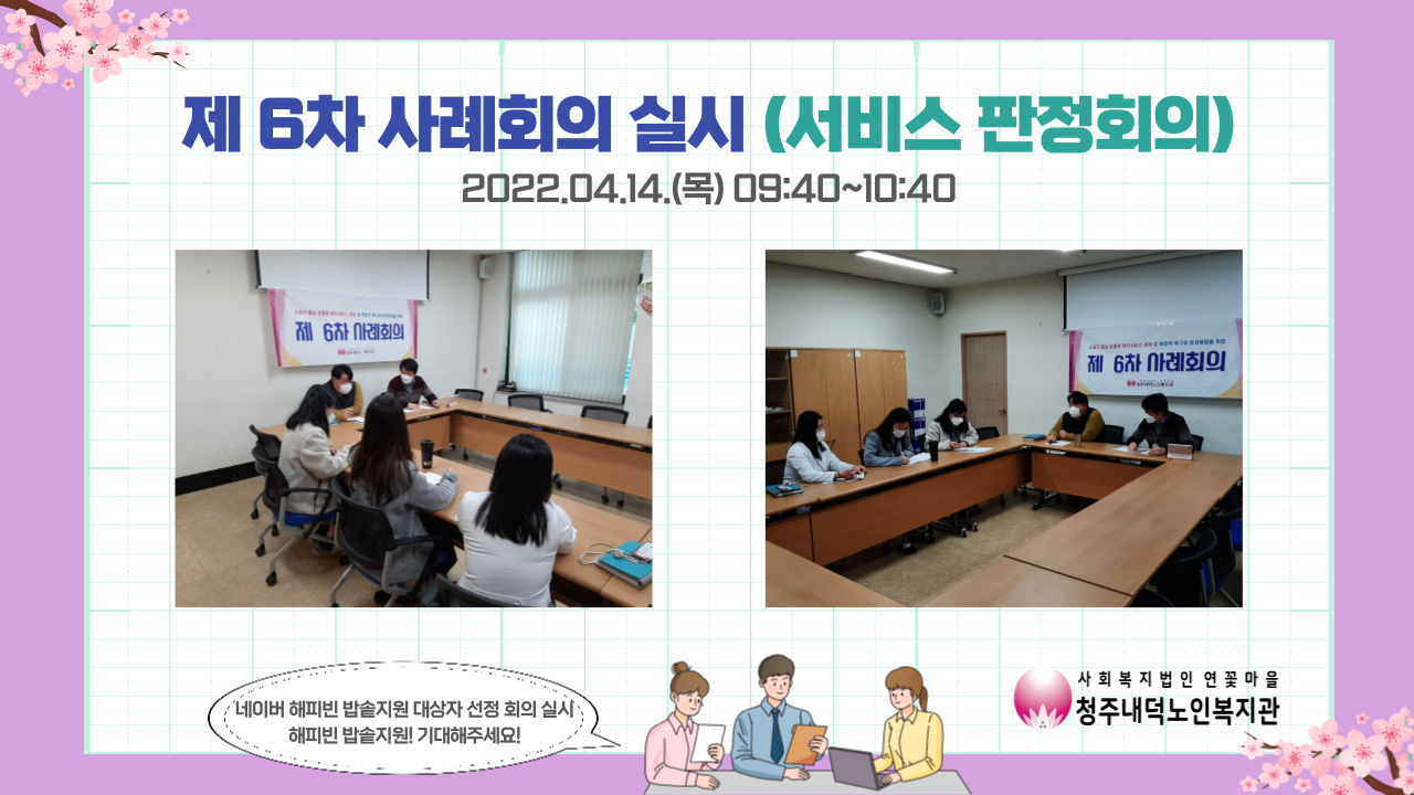 청주내덕노인복지관에서는 4월 14일(목) 09:40~10:40 복지관 상담실에서 제 6차 사례회의를 실시하였습니다. 이번 사례회의에서는 동지역 재가어르신들의 밥솥 상태와 지원 필요성을 논의하였습니다.