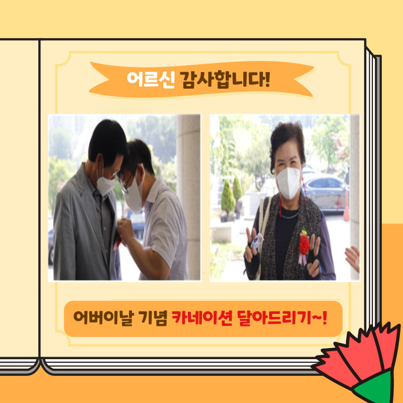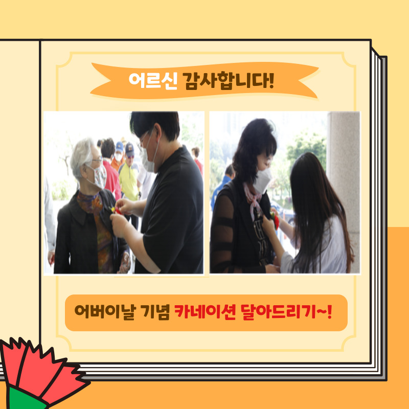 저희 복지관에서는 금일 어버이날 기념 행사를 실시하였습니다! 카네이션 달아드리기, 나를 위한 희망 메세지 적기, 기념품 증정 등 다채로운 행사가 진행되었습니다. 어르신들께서는 건강과 행복, 그리고 코로나19 이전의 일상을 위한 소망을 담아 희망 메세지를 작성하며 뜻 깊은 시간을 보냈다며 즐거워하셨습니다^^!!