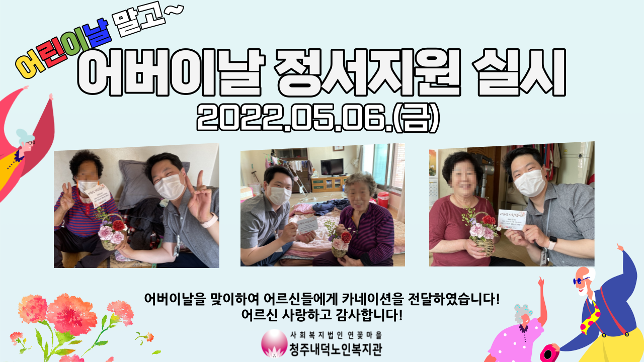5월 어버이날을 맞이하여 청주내덕노인복지관에서는 5월 6일 어버이날 전! 어르신들의 감사의 마음을 전하기 위해 재가어르신을 방문하여 어버이날 축하 인사를 드렸습니다~