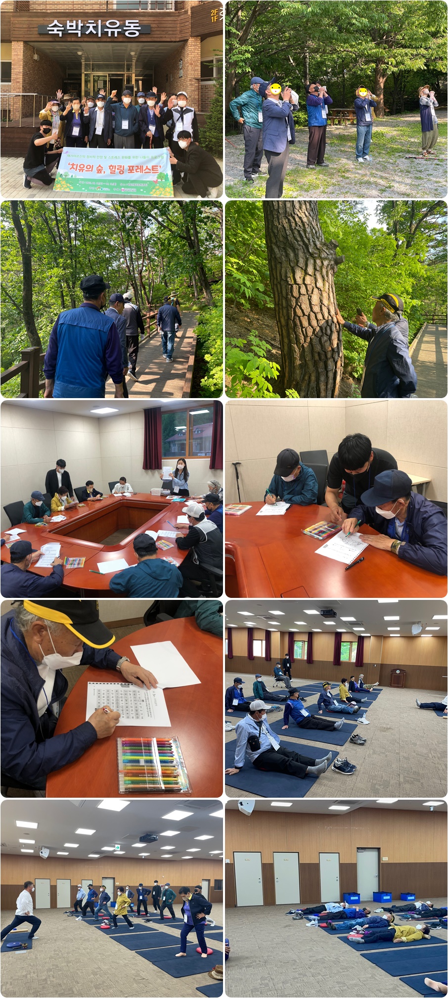 저희 복지관에서는 지난 5월 18일~19일 양일간 경상북도 영주의 국립산림치유원에서 지원하는 재가어르신 나들이 프로그램 ‘치유의 숲, 힐링포레스트’를 실시하였습니다! 재가복지서비스 대상자이신 어르신 중 우울감을 호소하고 계시는 10명의 참여자와 함께 1박 2일 나눔의 숲 캠프 프로그램에 참여하여 숲길 산책, 실내 균형 스트레칭, 통나무 명상으로 정서적 안정을 줄 수 있는 활동들을 실시하였습니다. 또한 인지 활동 프로그램으로 치매 예방을 위한 인지 능력을 향상 시킬 수 있는 프로그램도 진행하였습니다. 코로나19로 인해 장기간 외부활동의 기회가 적어 우울감을 호소하고 계셨던 어르신들에게, 야외 나들이 프로그램을 실시하여 정서적 안정에 도움을 줄 수 있는 정말 값진 시간이었습니다!!