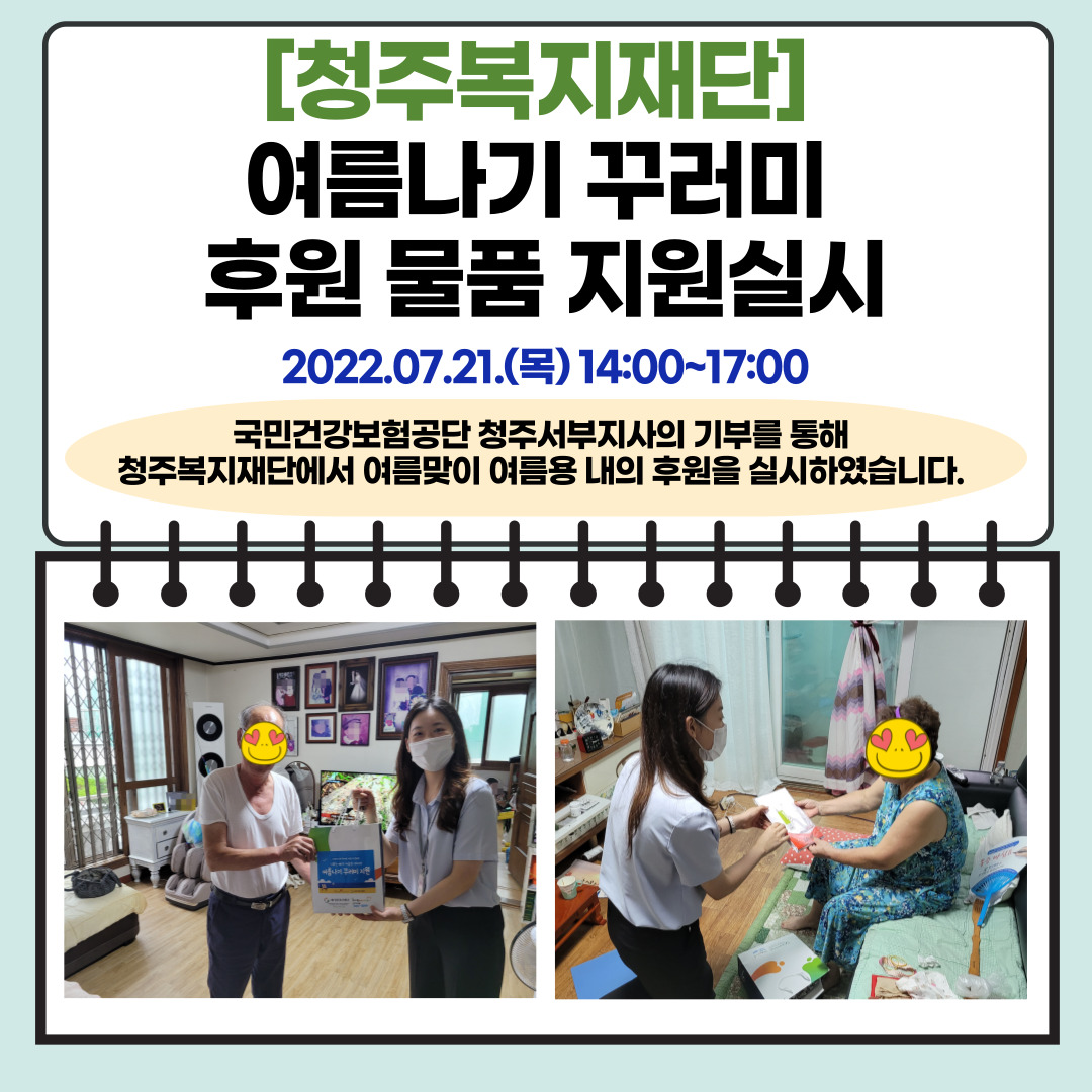 어르신들의 시원한 여름나기를 위해 후원해주신 청주복지재단에게 감사하다는 말씀 드리며, 앞으로도 어르신들의 행복한 삶을 위해 더 노력하는 복지관이 되겠습니다~!