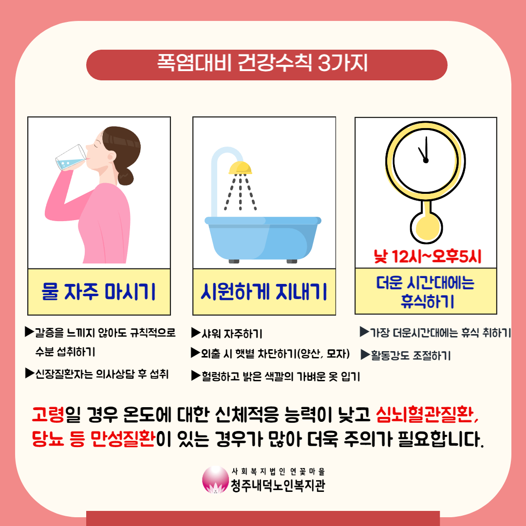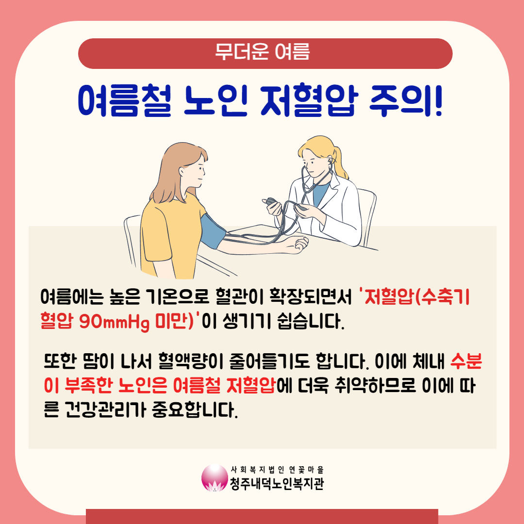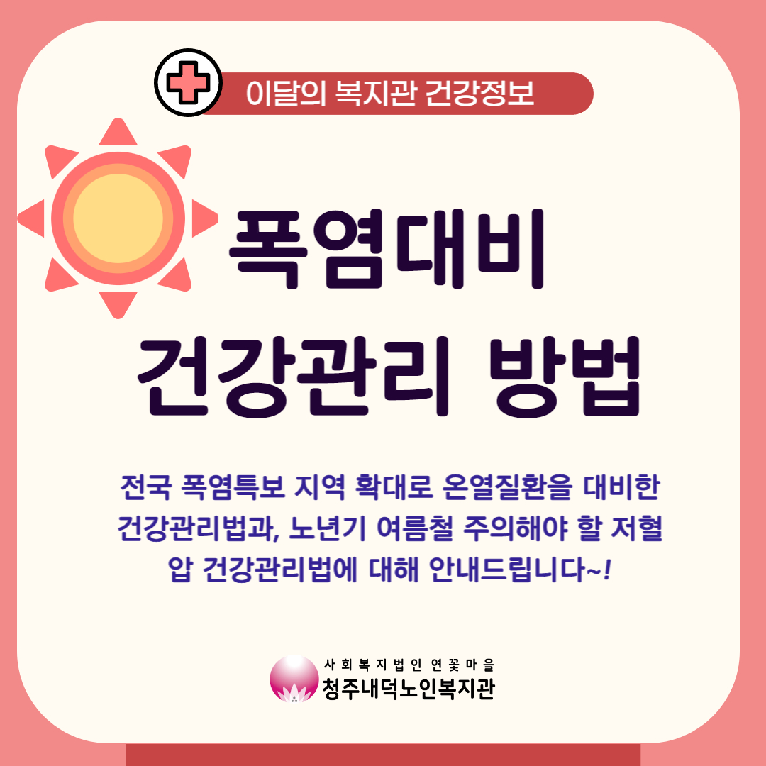 질병관리청은 당분간 전국 대부분 지역에서 일 최고 체감온도가 31도 이상으로 오를 것(기상청)으로 예상됨에 따라 무더위로 인한 온열질환 발생에 주의할 것을 당부하였습니다. 폭염으로 인한 건강피해는 건강수칙을 지키는 것만으로도 예방할 수 있으므로 건강수칙을 준수하는 것이 중요합니다! 아래 내용을 통해 폭염대비 건강수칙과 노년기를 위협하는 여름철 저혈압 예방수칙을 알고 건강한 여름을 준비하세요~!