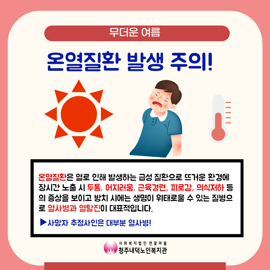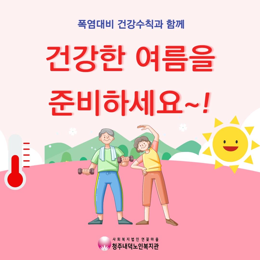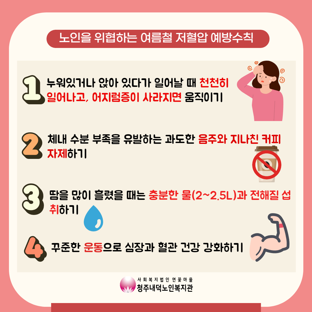 질병관리청은 당분간 전국 대부분 지역에서 일 최고 체감온도가 31도 이상으로 오를 것(기상청)으로 예상됨에 따라 무더위로 인한 온열질환 발생에 주의할 것을 당부하였습니다. 폭염으로 인한 건강피해는 건강수칙을 지키는 것만으로도 예방할 수 있으므로 건강수칙을 준수하는 것이 중요합니다! 아래 내용을 통해 폭염대비 건강수칙과 노년기를 위협하는 여름철 저혈압 예방수칙을 알고 건강한 여름을 준비하세요~!