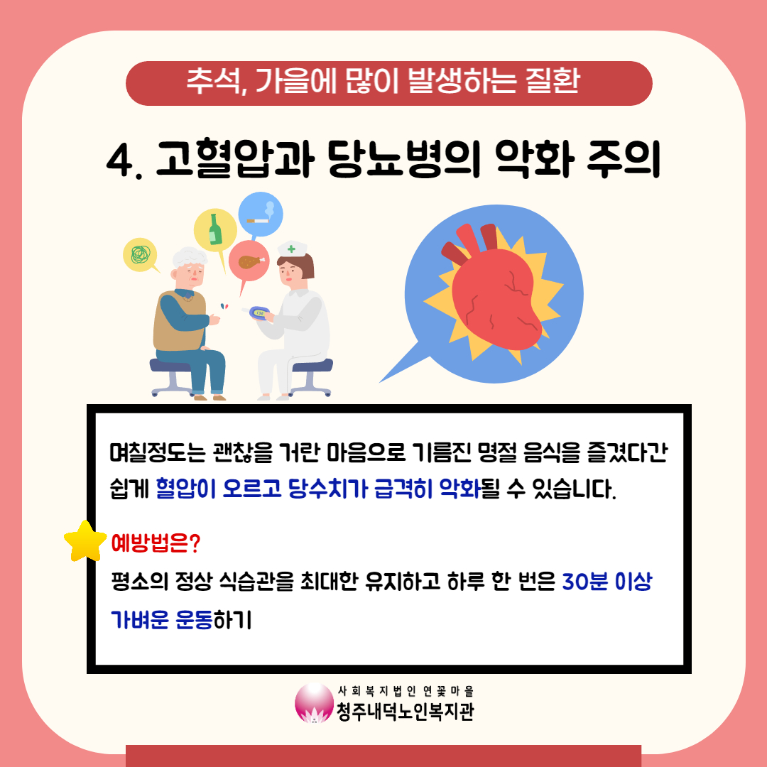 이와 같은 날씨에는 면역력과 질병에 노출되기 쉽고, 가을철 노년기에 쉽게 발생할 수 있는 질병에 대해 알고 주의를 해야 합니다. 오늘 건강소식을 통해 가을철 노년기 질환과 예방법을 알아보아요~!