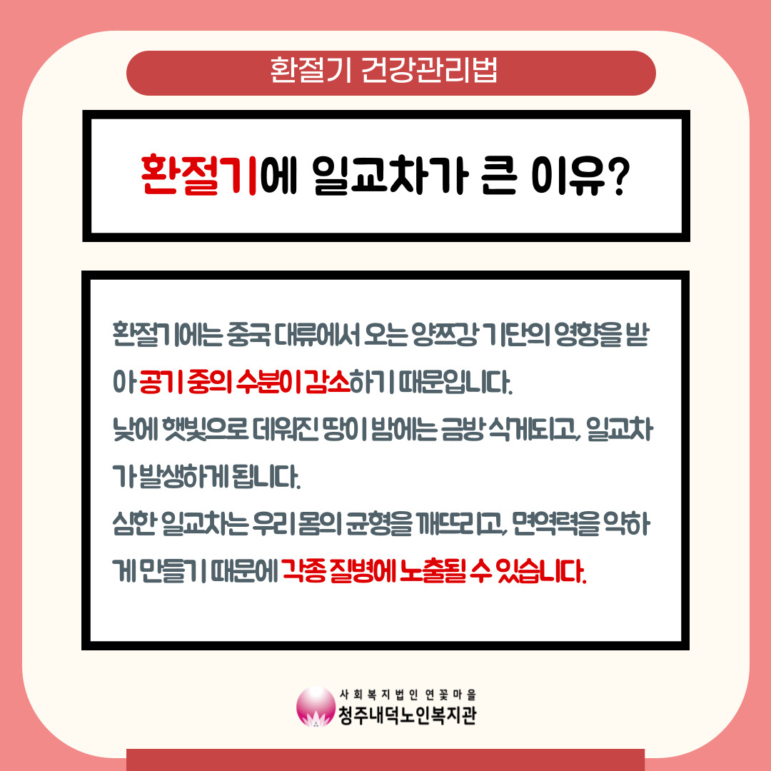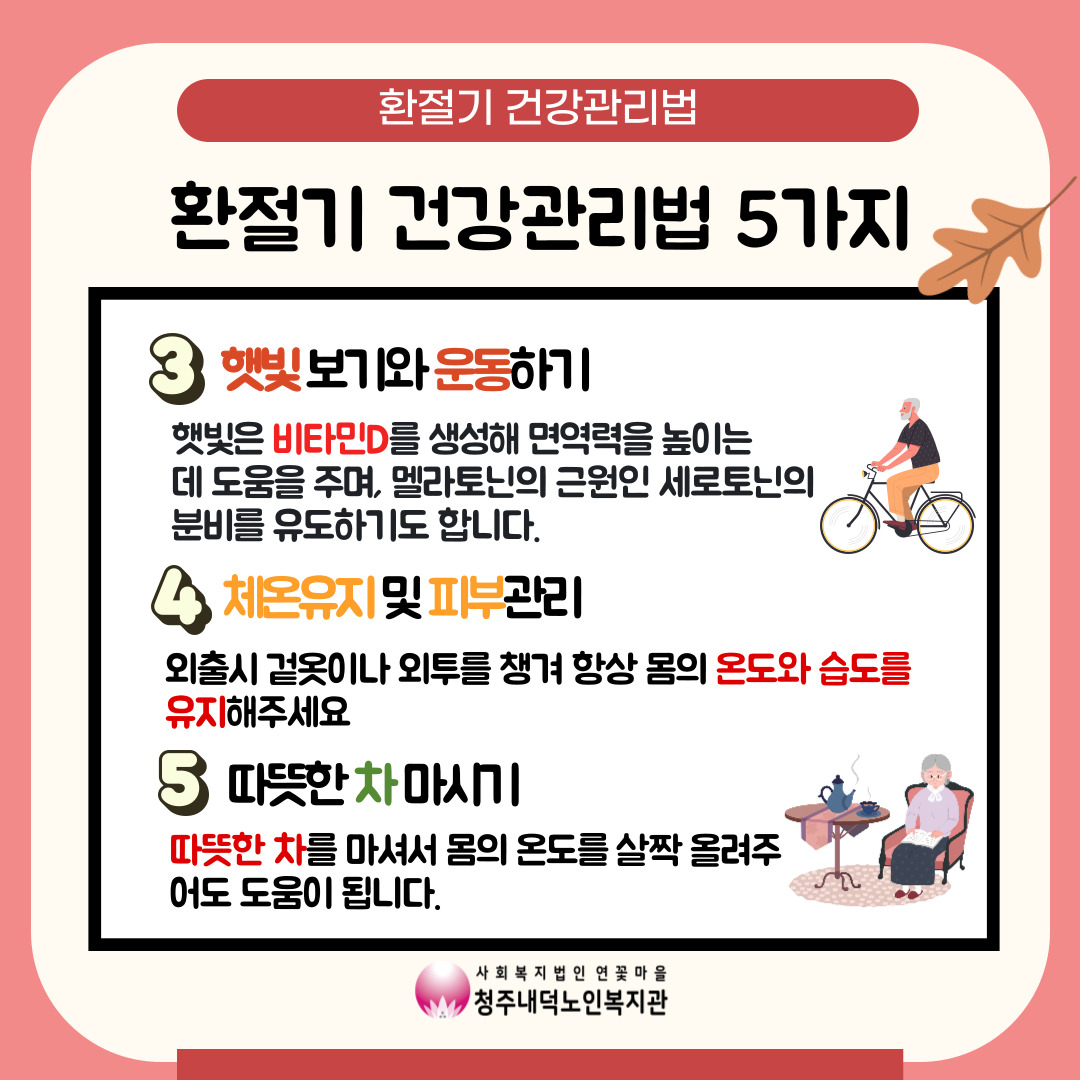 철이 바뀌는 환절기에는 기온 차가 커지고 공기가 건조해지면서 신체 면역력이 떨어지는 시기입니다~! 이 시기에는 바이러스들이 쉽게 인체에 침투할 수 있고, 질병으로 커질 가능성이 크며, 일교차로 인해서 감기에 쉽게 걸릴 수 있습니다. 그럼 이런 환절기에는 어떤 건강관리법으로 관리를 해야 할지, 노년기에 주의해야 할 질환은 무엇인지
