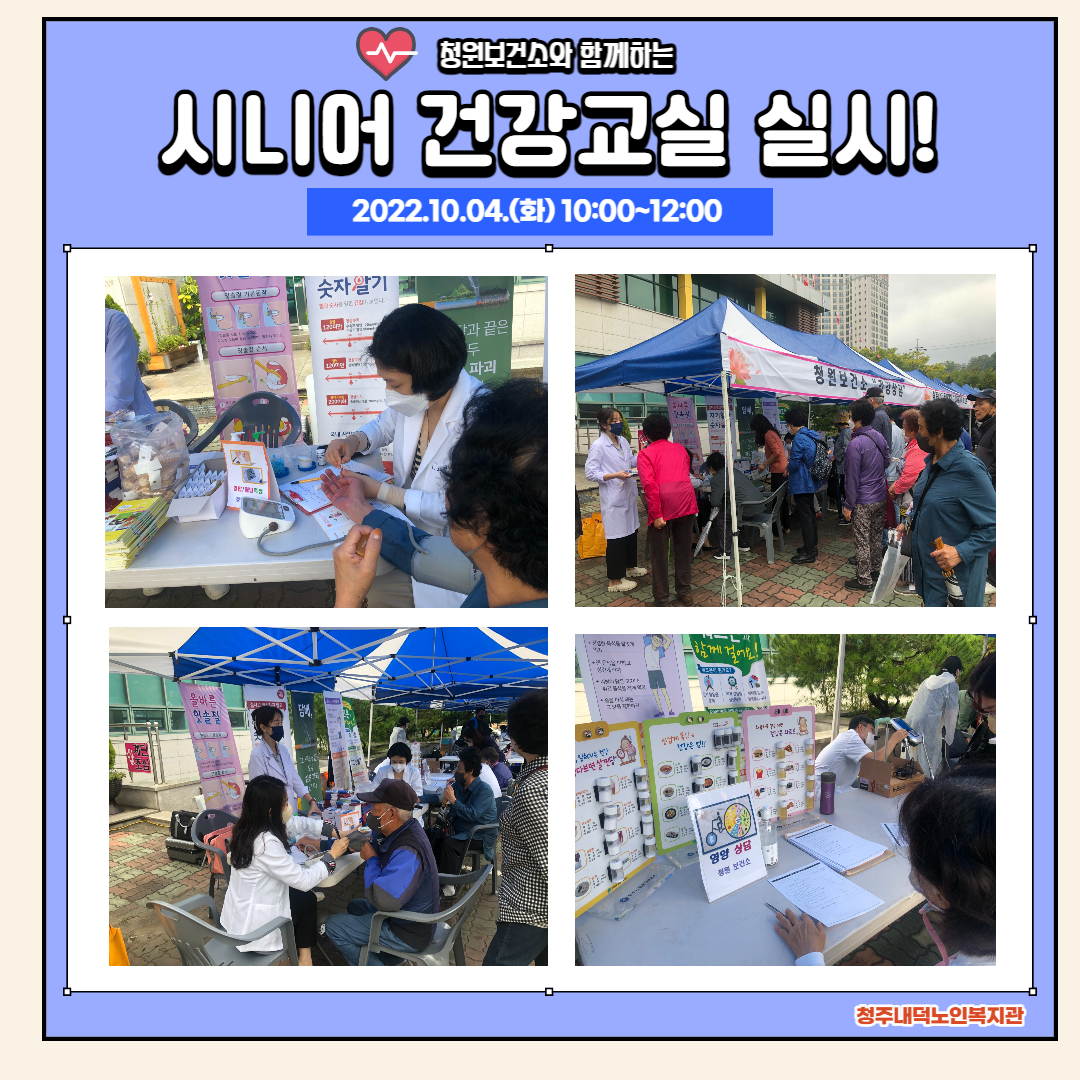 10월 4일(화) 10시~12시, 복지관에서 실시된 나눔바자회 체험부스 내에서 청원보건소와 함께하는 시니어 건강교실을 실시하였습니다~!