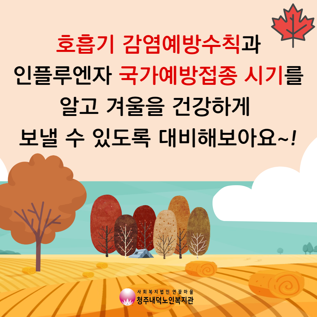 하루 일교차가 많이 나는 환절기입니다. 일반 감기도 걱정이지만 특히 독감이 유행하기 좋은 시기입니다. 면역력이 떨어지기 쉬운 아이, 임산부, 노인 계층을 대상으로 인플루엔자 예방접종을 실시하고 있다고 하니, 11월의 복지관 건강정보를 참고하여 각 접종 시기와 접종 장소를 알고 인플루엔자 유행에 미리 대비해주세요!!