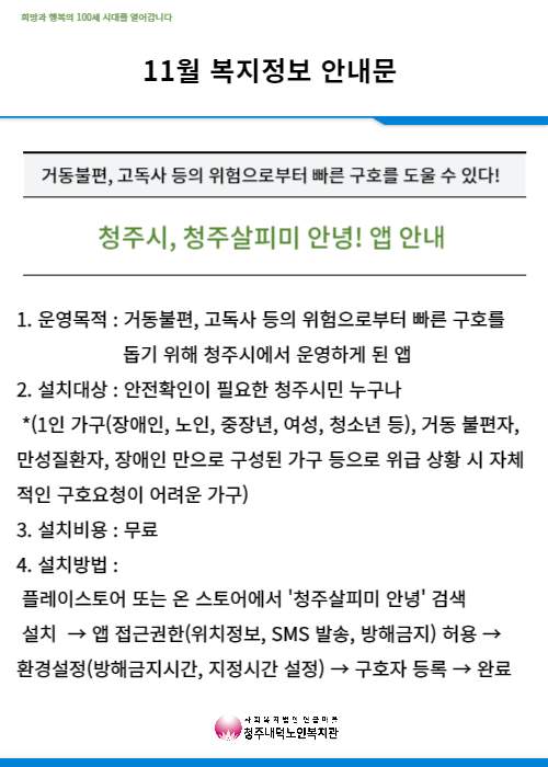 | 11월 복지정보 안내 - 청주살피미 안녕!(거동불편, 고독사 등의 위험으로부터 구호 앱) | |||
