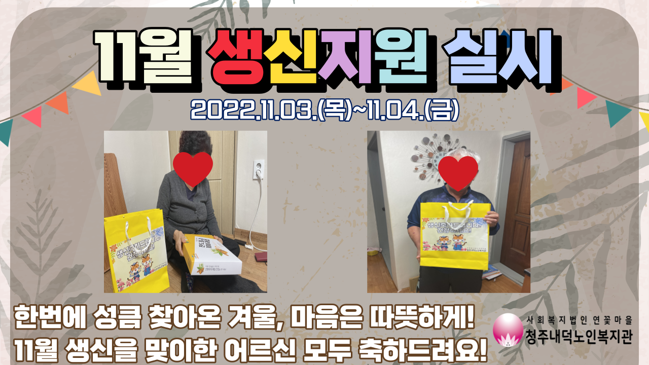 11월 3일과 4일 양일에 걸쳐 생신선물과 함께 어르신댁을 방문하여 정서지원을 실시하였습니다.