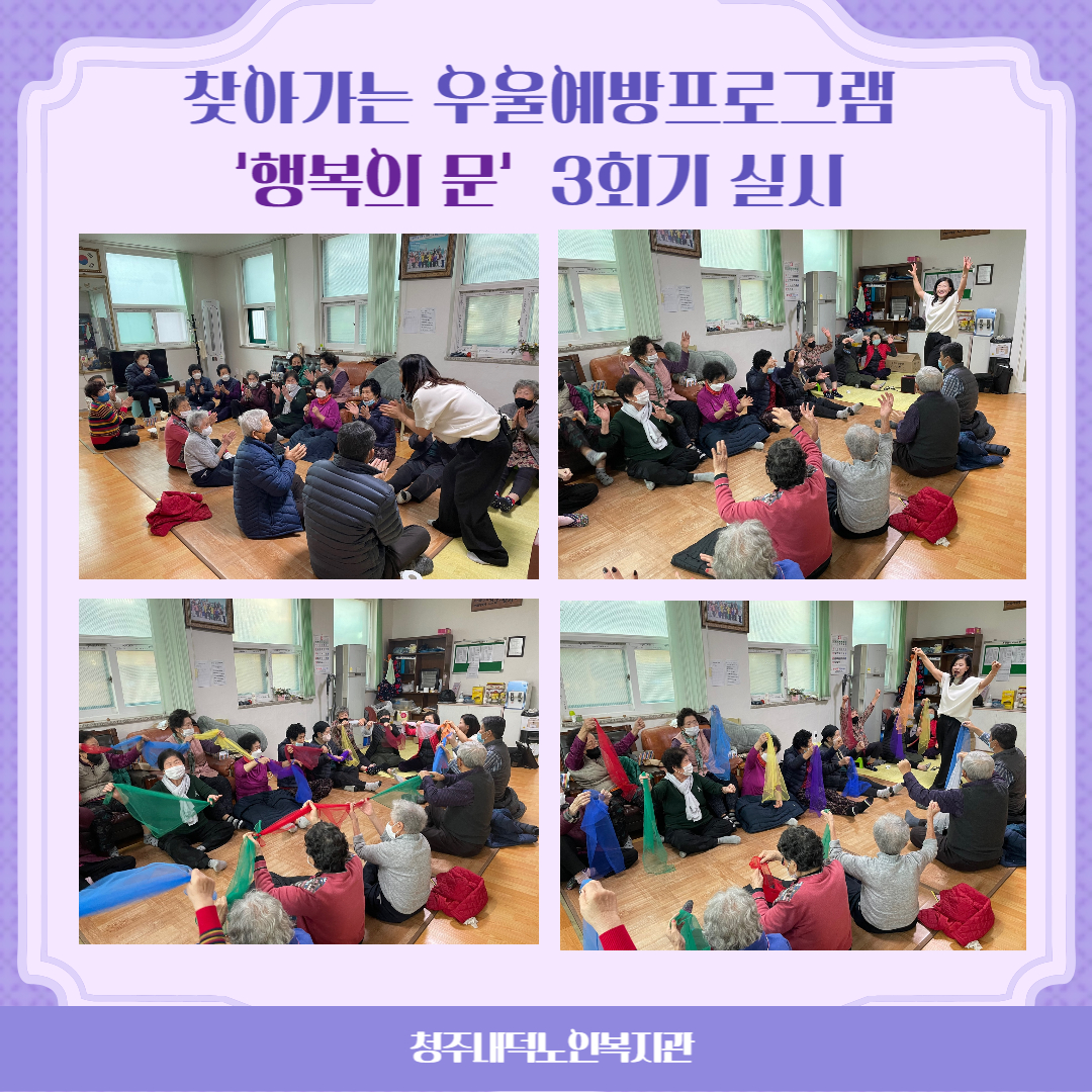 금일 15:00~16:00, 저희 복지관에서는 내수 삼일아파트 경로당에서 청주시청원정신건강복지센터와 연계하여 찾아가는 우울예방프로그램 '행복의 문'을 실시하였습니다.
