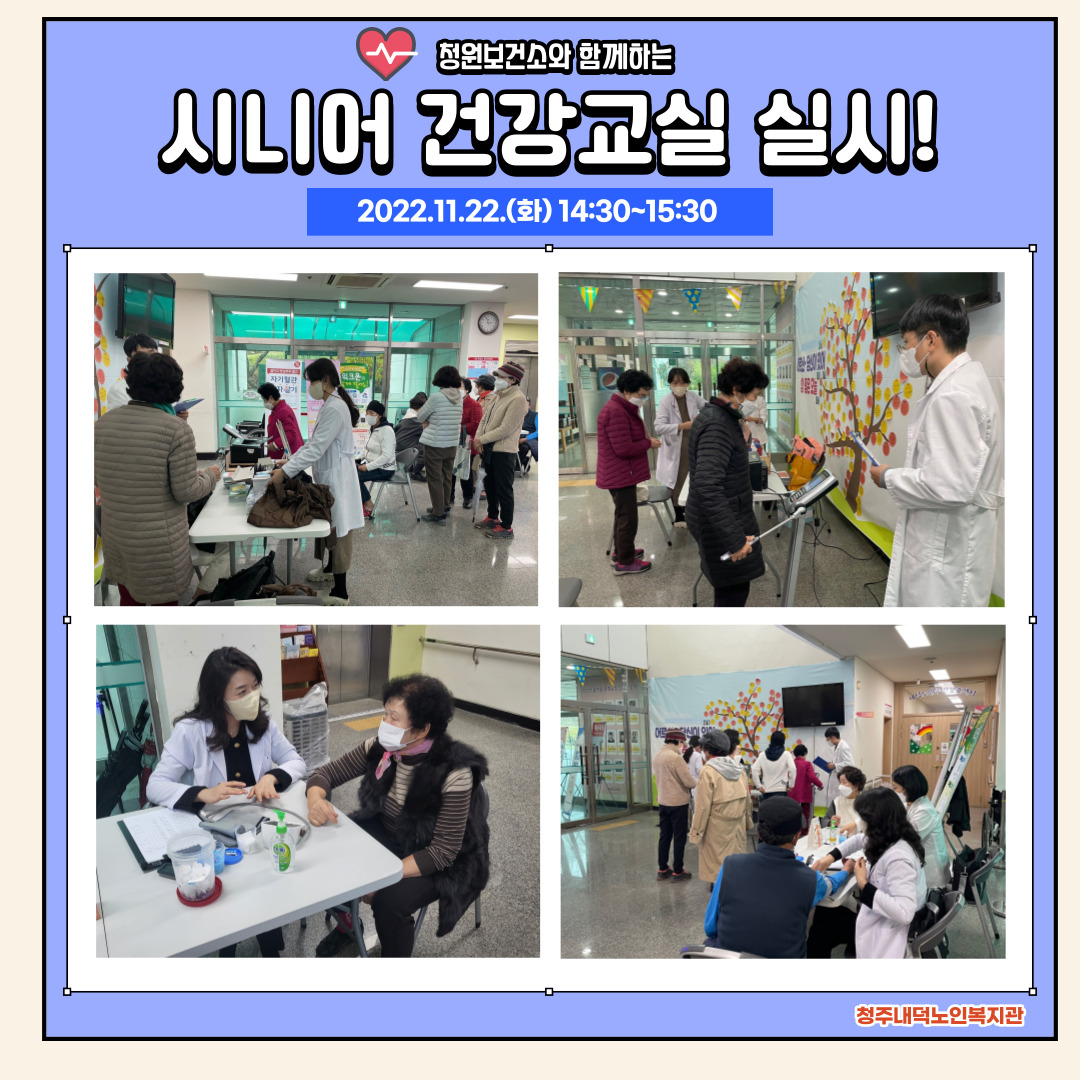 금일 복지관 1층 로비에서 14:30~15:30까지 청원보건소와 함께하는 시니어 건강교실을 실시하였습니다!