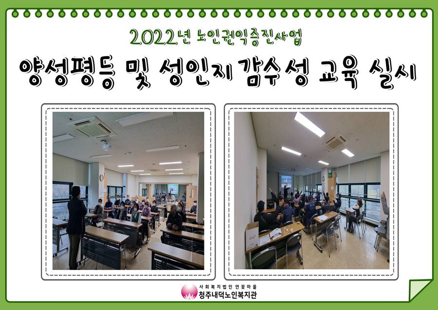 2022년 노인권익증진사업 '양성평등 및 성인지감수성 교육' 2022. 11. 29. (화) 10:00~12:00 실시되었습니다. 이번 강의는 샨티젠더폭력예방교육센터에서 강사님을 초빙하여 진행되었으며, 이용자분들이 다음세대를 위한 양성평등 교육과 손자 손녀를 위한 평등한 교육 방법 등을 배우는 시간이었습니다. 바쁜 시간에도 와주신 참여자 분들께 감사드립니다.