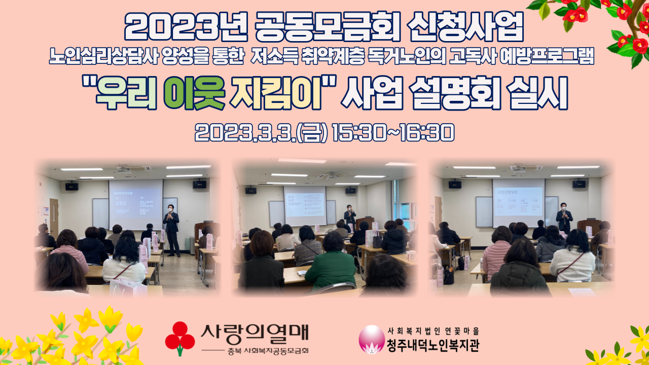 청주내덕노인복지관에서는 2023년 사회복지공동모금회의 지원을 받아 노인심리상담사 양성을 통한 저소득 취약계층 독거노인의 고독사 예방프로그램 "우리 이웃 지킴이"사업을 진행하고 있습니다.