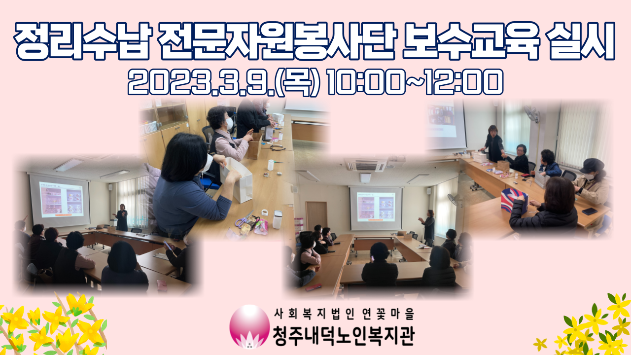 청주내덕노인복지관에서는 3월 9일 목요일 오전 10시부터 12시까지 정리수납 전문자원봉사단의 보수교육을 진행하였습니다!