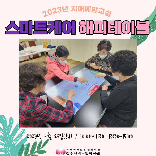 청주내덕노인복지관에서는 2023년 4월 25일(화) 오전(10:000~11:30)과 오후(13:30~15:00) 그룹별 치매예방교실 스마트케어 해피테이블 마지막 회기가 진행되었습니다.
