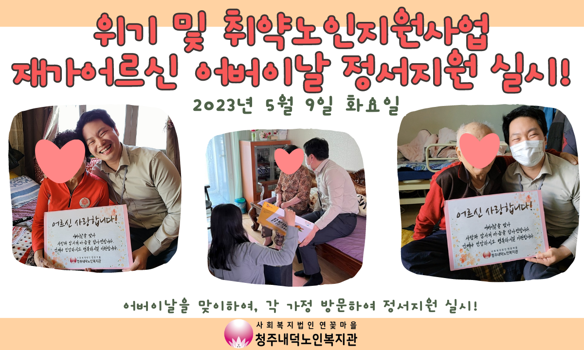 청주내덕노인복지관에서는 어버이날을 맞이하여 가족과 단절된 재가 어르신들의 정서지원을 위해 어버이날 정서지원을 실시하였습니다! 어버이날, 복지관에서는 즐겁고 흥겨운 노래자랑과 풍부한 먹거리로 떠들썩하게 지나갔지만 찾아오는 이가 없는 재가어르신 댁을 방문하여 비록 늦었지만, 정서지원활동을 진행하였습니다. 우암동에 거주하시는 신OO 어르신께서는 “아들놈들 있어봐야 연락도 안하는데, 선생님이 어떻게 아들보다 더 나아! 선생님이 아들 할려?” 하고 씁쓸한 농담도 넌지시 던지시곤 “이 집도 아들이 하나라서 안되겠네~” 하고 멋쩍게 웃으십니다.