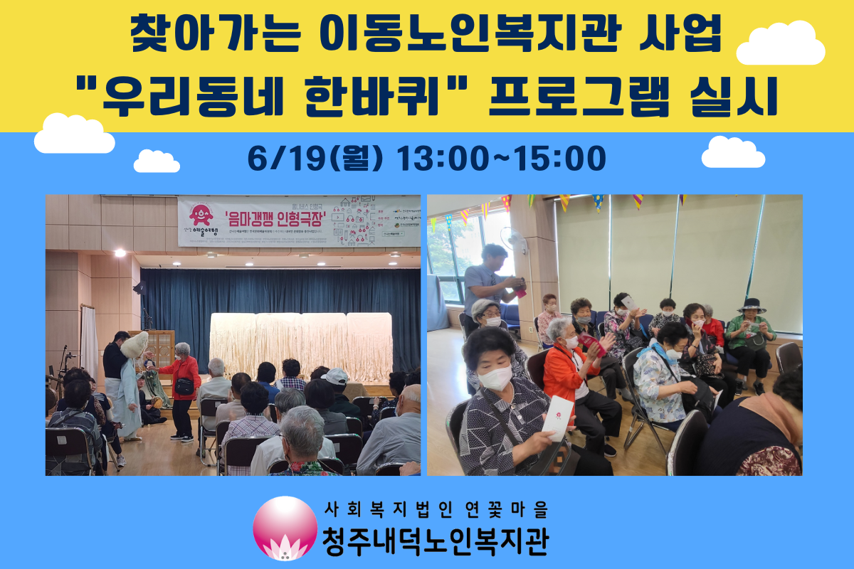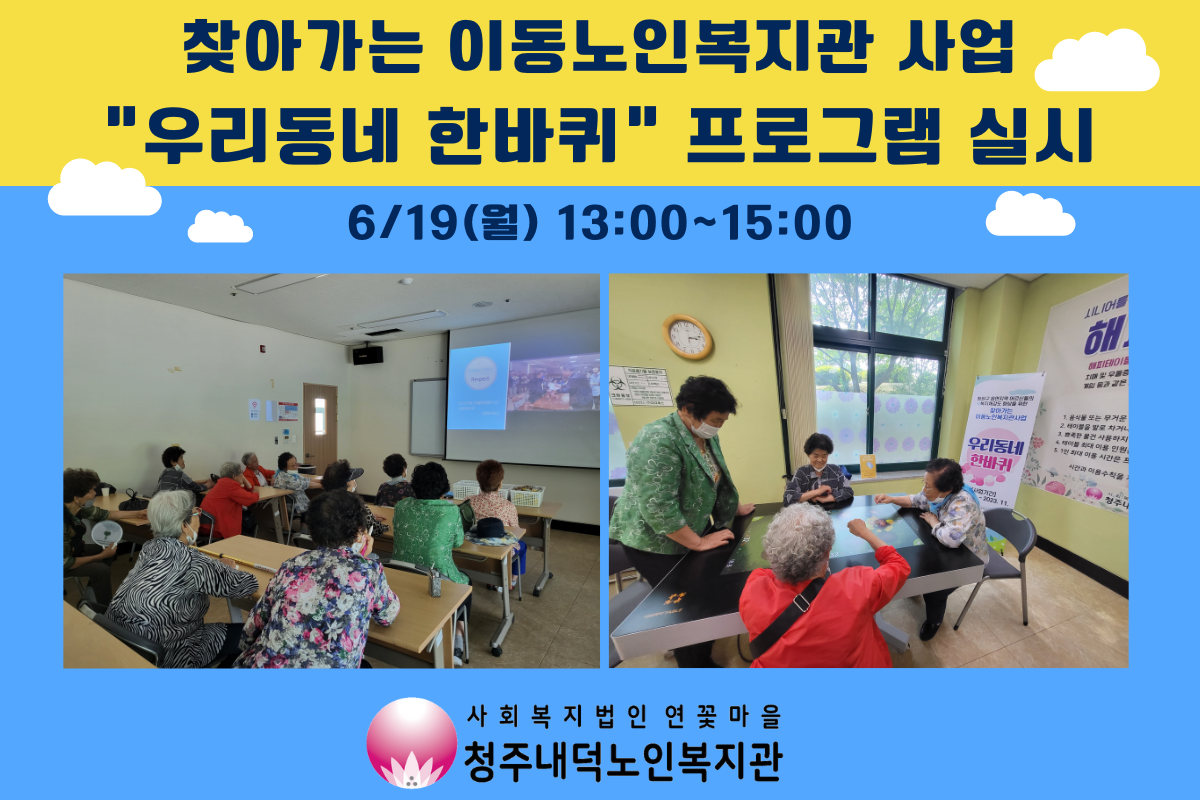 6/19(월) 청주내덕노인복지관에서는 찾아가는 이동노인복지관 “우리동네 한바퀴” 프로그램을 진행하였습니다! “우리동네 한바퀴”는 복지관에 대한 접근성이 낮은 청원구 읍면지역 어르신들을 대상으로 문화·여가 복지서비스의 격차를 해소하기 위한 취지에서 실시되었습니다~!