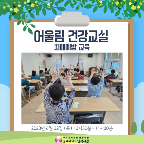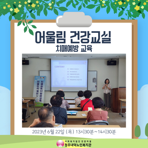 어울림 건강교실은 청원보건소 건강증진팀과 연계하여 진행되며, 마지막 6회기는 치매 예방 교육을 진행하였습니다.