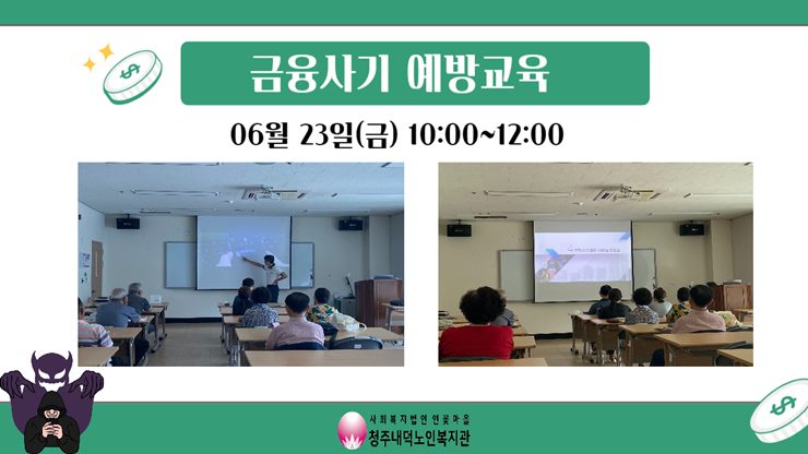 이번 교육은 금융감독원에서 강사님이 직접 오셔서 금융사기 피해사례들을 소개해주고 이에 대한 대처법에 대해 설명을 해주셨습니다. 영상에서의 상황을 상세하게 설명을 해줘서 참여자들이 이해하기 쉽게 해주셨고, 참여자들도 본인의 경험을 얘기하며 관련하여 질문을 하는 등 적극적으로 교육에 임해주셨습니다. 참여자들에게 금융사기에 대한 정보습득을 하는 좋은 시간이 되셨길 바라며 앞으로도 좋은 교육들을 제공할 수 있도록 노력하겠습니다!