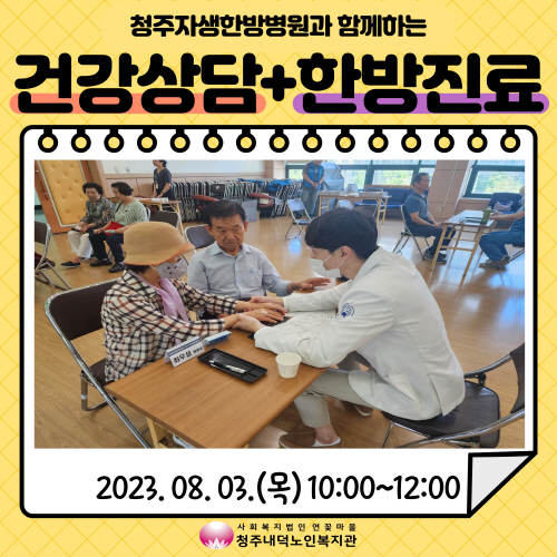 청주내덕노인복지관에서는 2023년 8월3일(목) 10:00~12:00 청주자생한방병원과 함께 노인 건강상담, 의료봉사가 1층 강당에서 진행되었습니다.