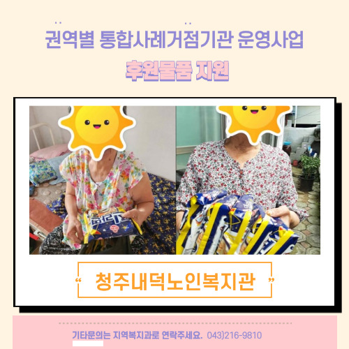 청주내덕노인복지관은 북부종합사회복지관과 (주)휴먼케어 약 35만원 상당의 후원물품을 지원하였습니다. 지원한 후원물품은 청원구 저소득 취약계층의 결식 예방을 위해 지원 될 예정입니다. 청주내덕노인복지관, 북부종합사회복지관, (주)휴먼케어는 청원구의 민간 사회안전망을 구축하기 위해 더욱 노력할 것을 약속드립니다.