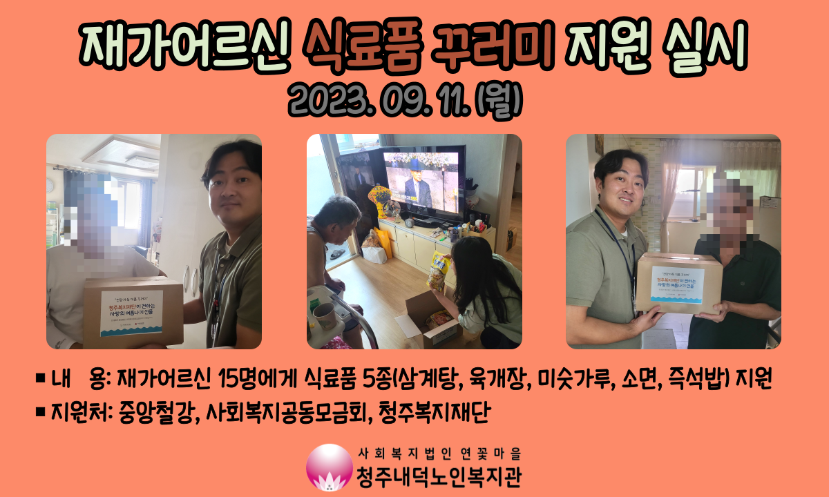 9/11(월) 청주내덕노인복지관에서는 저소득 독거 남성어르신 15명을 대상으로 식료품 꾸러미를 전달하였습니다~