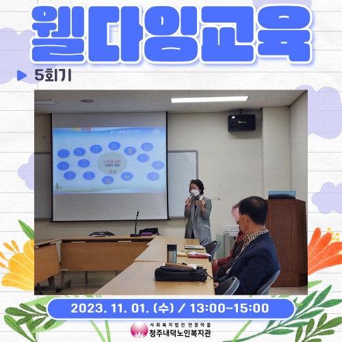 청주내덕노인복지관에서는 11월1일(수) 대한웰다잉협회와 연계한 웰다잉교육 집단상담 5회기가 진행되었습니다. 이번 5회기 교육은 대한웰다잉협회 충남아산지부 지향순회장님의 강의로 진행되었습니다.