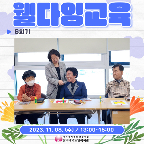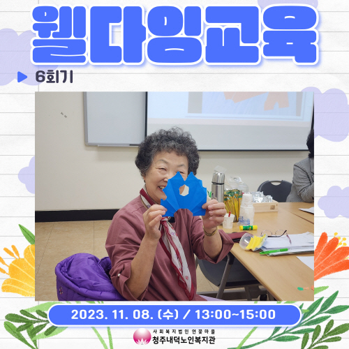 청주내덕노인복지관에서는 11월8일(수) 대한웰다잉협회 충남아산지부 지향순회장님과 함께 진행하는 웰다잉교육 집단상담 마지막 6회기가 진행되었습니다.