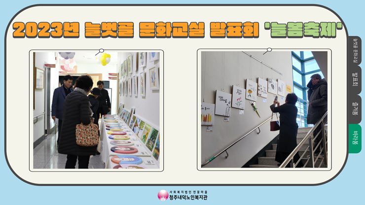 2023년 늘벗골 문화교실 발표회 '늘봄축제'가 진행되었습니다. 식전 행사로는 현대몬테소리어린이집 아이들이 축하공연으로 노래와 율동을 선보였으며, 늘벗골 자원봉사회 임원분들께 감사패가 수여되었습니다. 본 행사인 공연 즐겨봄에서는 하모니카, 실버난타, 생활댄스 초급, 줌바라인댄스, 생활댄스 중급, 라인댄스, 민요교실, 우쿨렐레, 포크기타 9개의 강좌가 참가해주셨으며, 1년동안 각 강좌에서 배우신 다양한 댄스, 악기들의 솜씨를 마음껏 보여주셨습니다. 전시회 바라봄은 1층 로비 및 각 층 계단에서 진행되었으며, 늘벗골 문화교실 강좌에서는 수묵캘리그라피, 색연필화 강좌가 참여해주어 멋진 작품들을 전시해주었으며, 그 외에도 평생학습우수프로그램 라탄공예, 노인자율봉사활동사업 공예누리 봉사단의 새활용공예, 노인자원봉사활성화지원사업 실실뜨개 봉사단의 뜨개 작품, 노인인식개선공모전 당선작, 미술반의 다양한 작품들이 전시되어 방문자들에게 풍성한 볼거리를 제공하였습니다. 발표회 진행을 위해 열심히 노력하신 수강생분들과 지도하느라 수고해주신 강사님들, 행사 진행에 도움을 주신 관계자 및 유관기관께 다시 한번 감사드리며 앞으로도 복지관 이용자분들이 발표회를 즐기실 수 있도록 노력하겠습니다! |