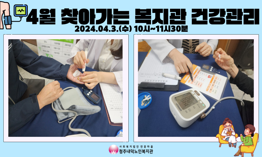 저희 청주내덕노인복지관에서는 매월 첫번째 수요일 10시부터 11시30분까지 찾아가는 복지관 건강관리가 진행되니