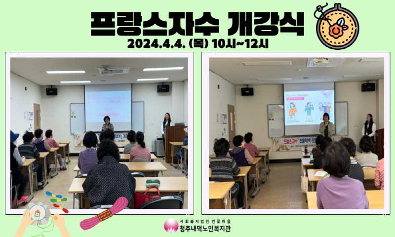 2024년 4월 4일(목) 10시부터 청주내덕노인복지관 2층 배움방에서 2024년 평생학습우수프로그램지원사업인 프랑스자수, 조물락꼬물락 프로그램 개강식이 진행되었습니다.